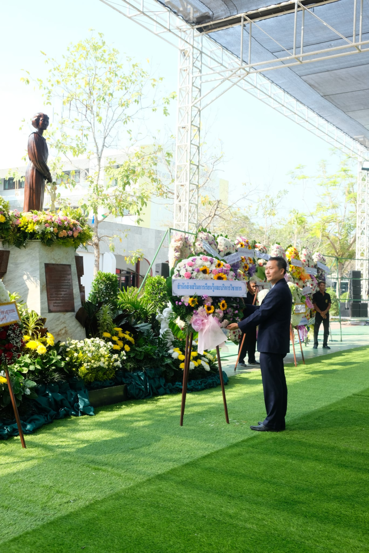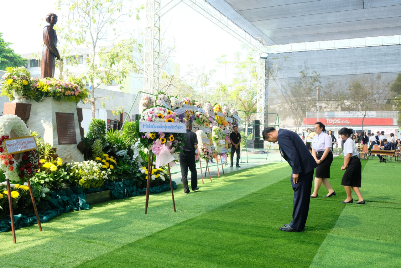 นำโดยผศ.เศกพร ตันศรีประภาศิริ ผู้อำนวยการสำนักส่งเสริมการเรียนรู้และบริการวิชาการ ผู้บริหาร และเจ้าหน้าที่เข้าร่วมพิธีวางพวงมาลาพระอนุสาวรีย์ สมเด็จพระราชปิตุจฉา เจ้าฟ้าวไลยอลงกรณ์ กรมหลวงเพชรบุรีราชสิรินธร ณ ลานเจ้าฟ้าวไลยองกรณ์